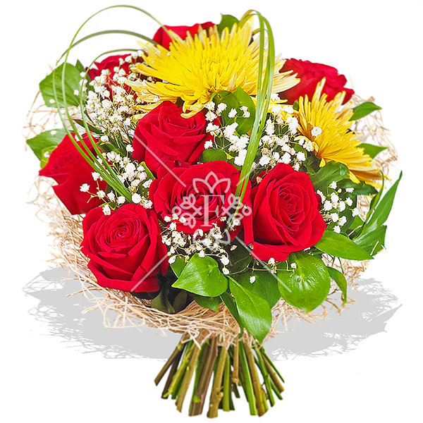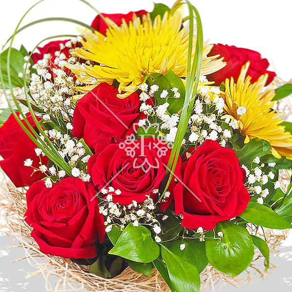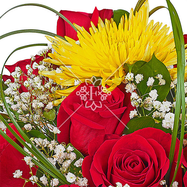 В этой цветочной композиции алые розы чудесно сочетаются с солнечно-желтой хризантемой. Это классическое сочетание цветов, которое выглядит элегантно и стильно. Композицию украшают нежная декоративная зелень и белоснежная, невесомая гипсофила.