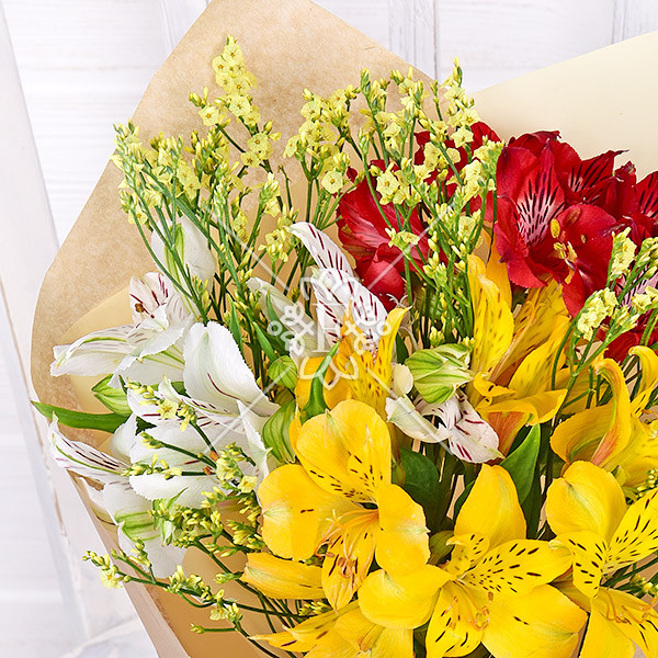 Альстромерия красная – 1 шт., альстромерия белая – 1 шт., альстромерия желтая – 1шт, лимониум желтый – 1 шт., упаковка, лента.