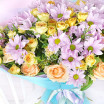 Роза кремовая (персиковая)-1шт, роза желтая кустовая –1шт., хризантема кустовая светло-сиреневая-1шт., хамелациум- 1шт.,  упаковка, лента.