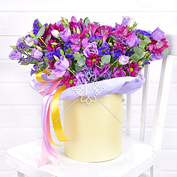 эустома фиолетовая – 5 шт., альстромерия фиолетовая – 2 шт., хризантема кустовая фиолетовая  - 2 шт., статица фиолетовая – 3 шт., декоративная зелень (эвкалипт, лимониум фиолетовый), оазис, коробка, лента.